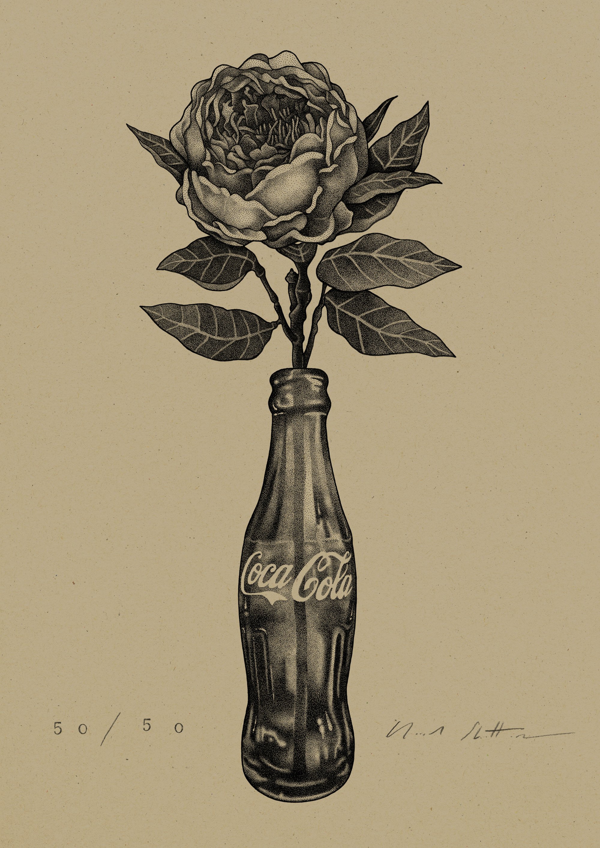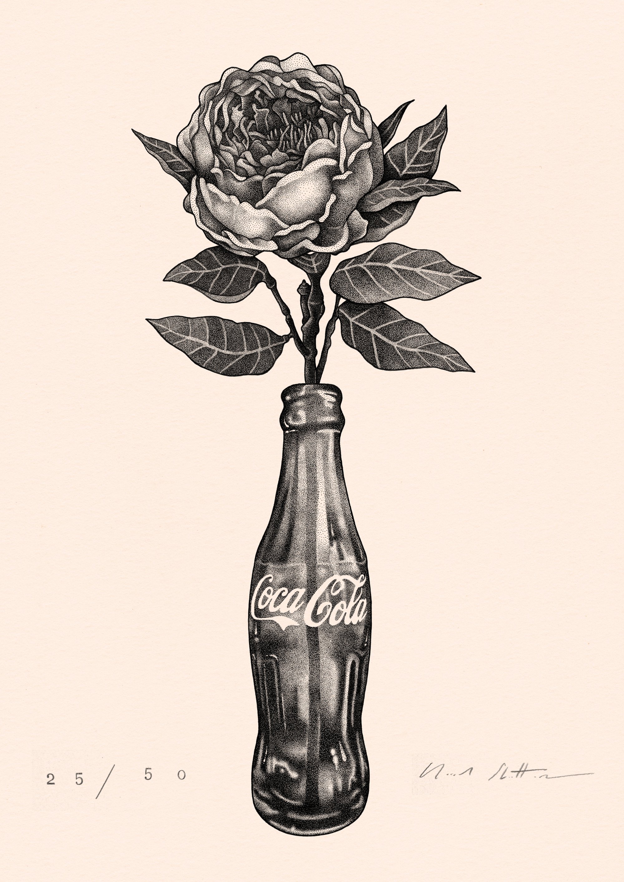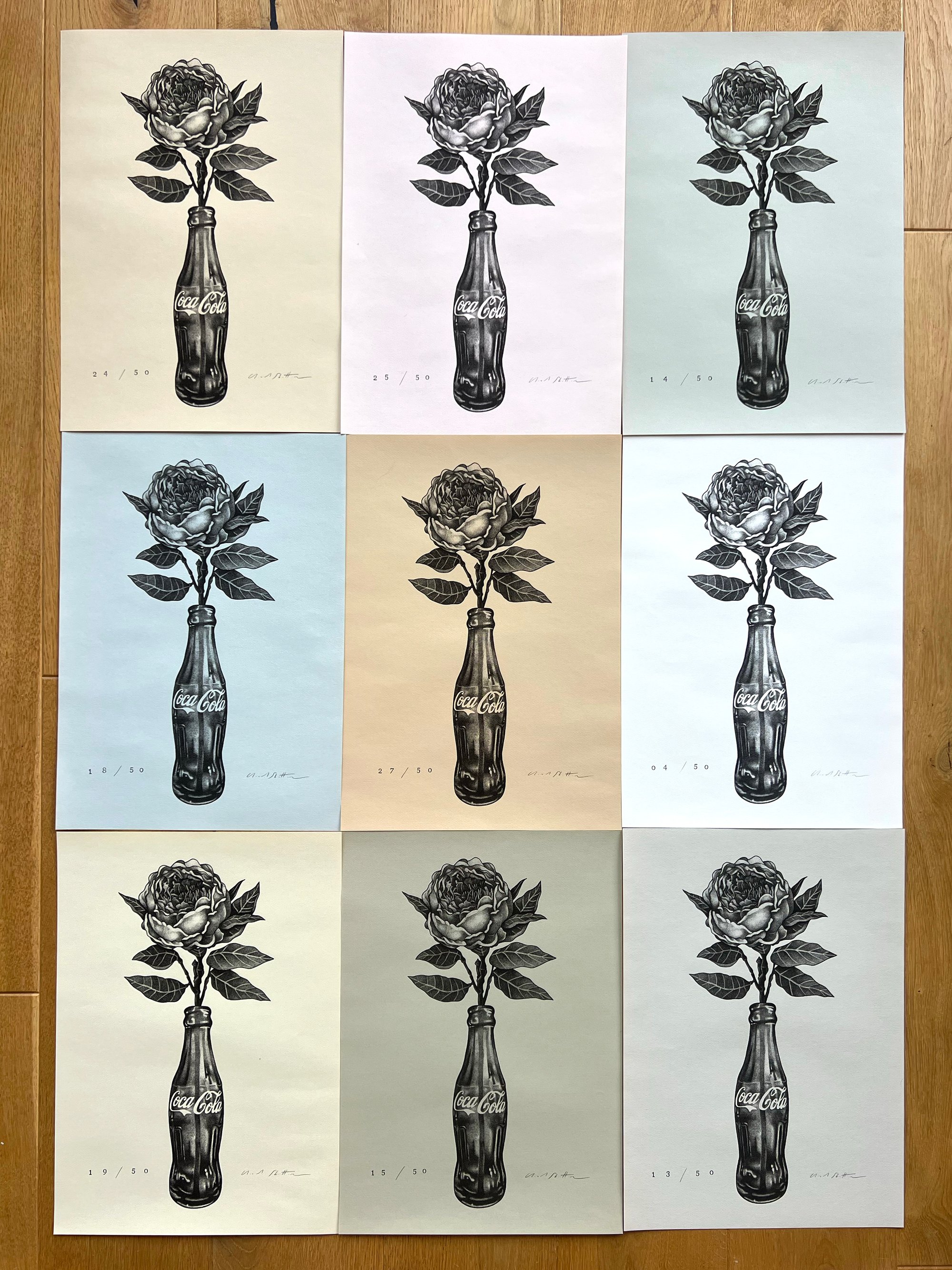 A limited run of 50 bespoke, hand made prints featuring the latest design in my floral bottle series: the classic glass Coca Cola bottle.